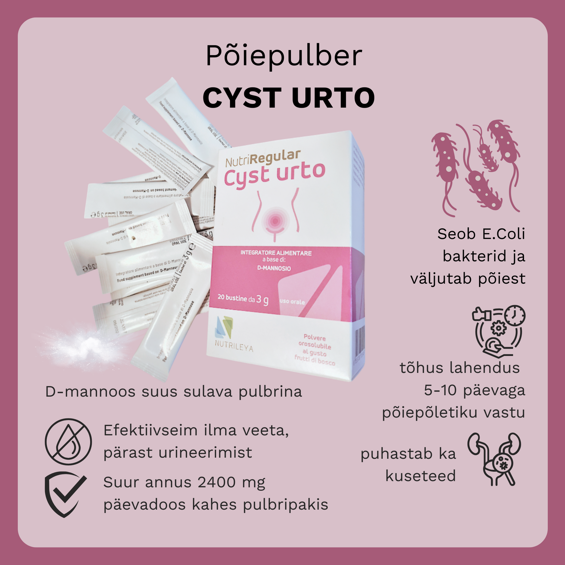 Dette er et av få urinveisprodukter som inneholder en høy dose D-mannose i et oralt oppløselig pulver. Det er 10 poser i pakken.